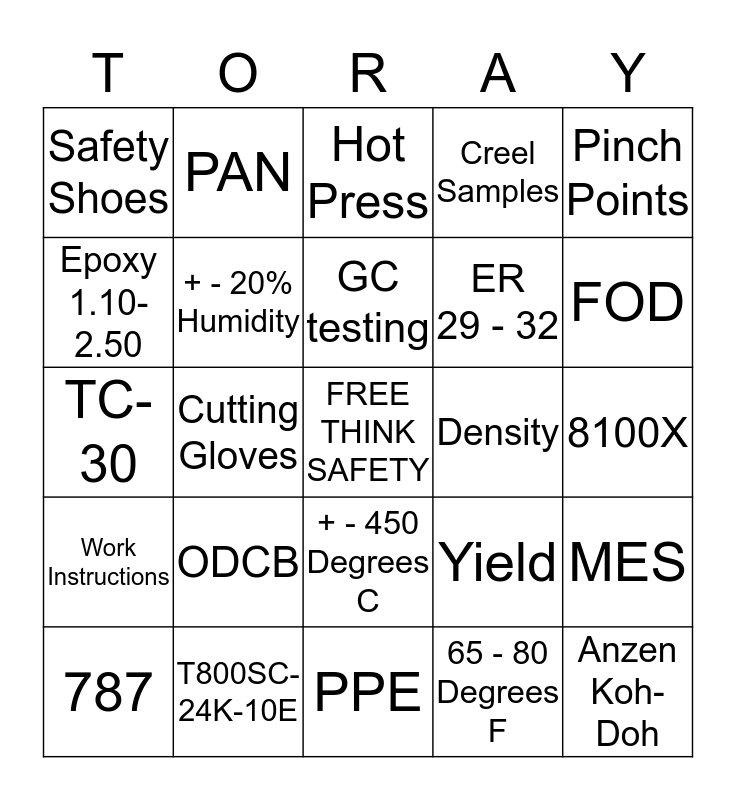 This bingo card has a free space and 29 words: 787, ILSS, Cutting Gloves, 'TORAY', Safety Shoes, Hot Press, + - 20% Humidity, ODCB, Density, T800SC-24K-10E, 8100X, Anzen Koh-Doh, PPE, 65 - 80 Degrees F, FOD, Tensile 592 - 689, + - 450 Degrees C, Work Instructions, Pinch Points, TC-30, Yield, Bundle 180 - 216, ER 29 - 32, Epoxy 1.10- 2.50, Creel Samples, PAN, MES, GC testing and Safety Glasses.
