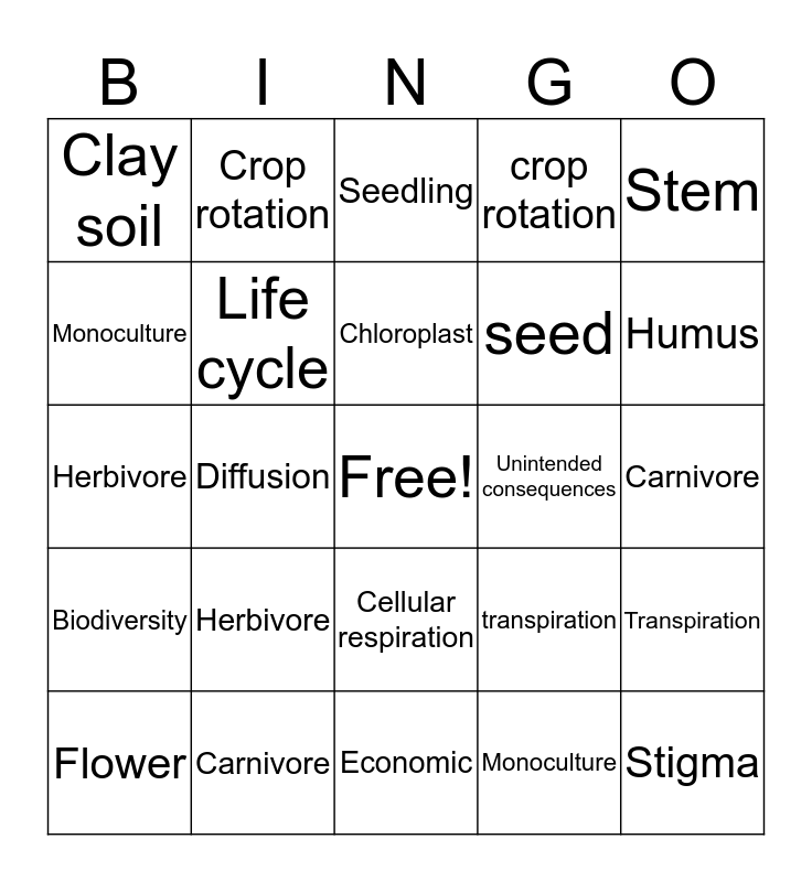 This bingo card has a free space and 37 words: Pollinators, Biodiversity, Seed, Life cycle, Transpiration, Herbivore, Chloroplast, Roots, Stem, Capillary action, Diffusion, crop rotation, Stigma, Carnivore, Monoculture, Biodiversity, Leaves, Seedling, Cellular respiration, Unintended consequences, Clay soil, Humus, Flower, Economic, Biodiversity, Monoculture, Crop rotation, Life cycle, Pollinators, Diffusion, Chloroplast, Carnivore, Herbivore, stem, transpiration, seed and roots.