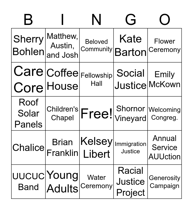 This bingo card has a free space and 49 words: Rev. Florence, Generosity Campaign, Fireplace Room, Water Ceremony, Brian Franklin, Library, Matthew, Austin, and Josh, Dr. Michele Grove, Care Core, Sanctuary, Coffee House, Kate Barton, Annual Service AUUction, Immigration Justice, Rev. Breeden, Religious Education, Fellowship Hall, Shornor Vineyard, Rood Loft, Flower Ceremony, Children's Chapel, Racial Justice Project, Sherry Bohlen, Social Justice, Strategic Visioning, Emily McKown, UUCUC Band, Choir and CrUUners, Kelsey Libert, Chalice, Rose Window, Wall Hangings, Organ & Piano, Mission and Vision, Young Adults, Worship Associates, Pastoral Care Associates, Board of Trustees, Welcoming Congreg., UU the Vote, Morning Meditation, Our Whole Lives, Black Lives Matter, Green Sanctuary, Roof Solar Panels, Beloved Community, Soul Matters, Shared Offerings and Partner Churches.