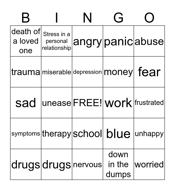 This bingo card has a free space and 24 words: therapy, drugs, depression, drugs, abuse, death of a loved one, trauma, Stress in a personal relationship, work, school, money, sad, blue, unhappy, miserable, down in the dumps, frustrated, angry, fear, unease, worried, symptoms, panic and nervous.