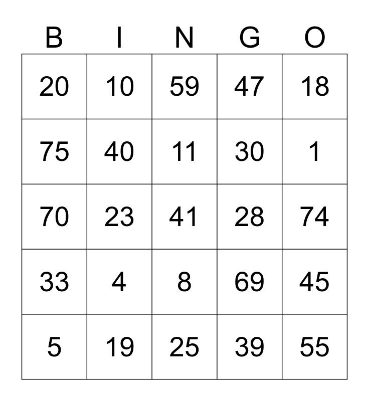 This bingo card has 25 words: 4, 25, 11, 5, 18, 20, 75, 10, 28, 8, 30, 70, 69, 45, 40, 55, 74, 59, 1, 23, 41, 19, 33, 47 and 39.