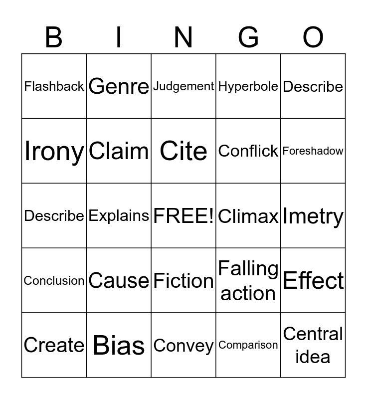 This bingo card has a free space and 24 words: Cause, Bias, Cite, Create, Describe, Flashback, Irony, Genre, Climax, Fiction, Conflick, Describe, Falling action, Effect, Claim, Comparison, Imetry, Judgement, Foreshadow, Explains, Central idea, Conclusion, Hyperbole and Convey.