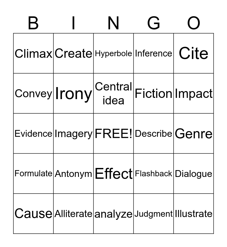 This bingo card has a free space and 24 words: Antonym, Alliterate, Central idea, Cause, Cite, Climax, Convey, Create, Describe, Effect, Fiction, Evidence, Flashback, Dialogue, Irony, Judgment, Genre, Hyperbole, Impact, Imagery, Illustrate, Formulate, Inference and analyze.