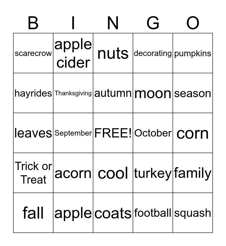 This bingo card has a free space and 24 words: acorn, apple, autumn, fall, pumpkins, scarecrow, hayrides, apple cider, October, cool, moon, leaves, turkey, family, Thanksgiving, football, corn, nuts, season, September, squash, Trick or Treat, decorating and coats.