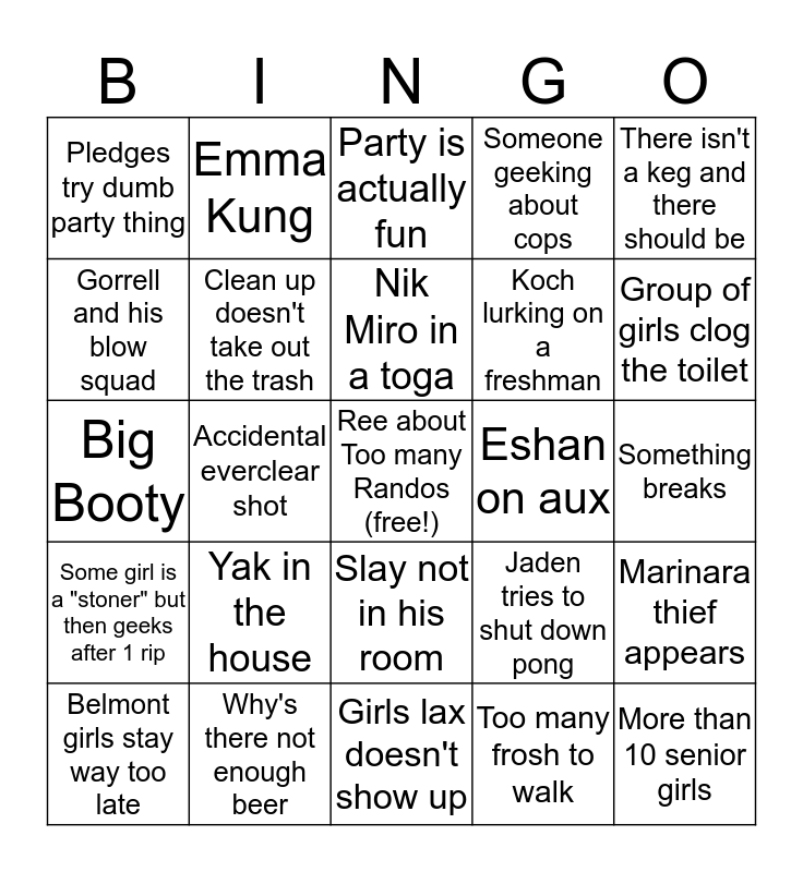 This bingo card has a free space and 24 words: Yak in the house, Why's there not enough beer, Nik Miro in a toga, Belmont girls stay way too late, There isn't a keg and there should be, Pledges try dumb party thing, Gorrell and his blow squad, Emma Kung, Eshan on aux, Slay not in his room, Koch lurking on a freshman, Big Booty, Jaden tries to shut down pong, Marinara thief appears, Clean up doesn't take out the trash, Too many frosh to walk, Something breaks, Party is actually fun, Group of girls clog the toilet, Accidental everclear shot, More than 10 senior girls, Some girl is a "stoner" but then geeks after 1 rip, Someone geeking about cops and Girls lax doesn't show up.