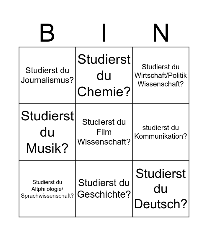 This bingo card has a free space and 8 words: studierst du Kommunikation?, Studierst du Wirtschaft/Politik Wissenschaft?, Studierst du Chemie?, Studierst du Altphilologie/ Sprachwissenschaft?, Studierst du Journalismus?, Studierst du Deutsch?, Studierst du Musik? and Studierst du Geschichte?.