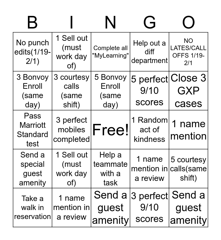 This bingo card has a free space and 24 words: 1 Sell out (must work day of), 1 name mention in a review, 5 Bonvoy Enroll (same day), Take a walk in reservation, NO LATES/CALL OFFS 1/19-2/1, No punch edits(1/19-2/1), 3 Bonvoy Enroll (same day), 1 Sell out (must work day of), 1 Random act of kindness, Help a teammate with a task, 5 perfect 9/10 scores, Pass Marriott Standard test, 1 name mention in a review, 5 courtesy calls(same shift), 3 courtesy calls (same shift), 3 perfect 9/10 scores, 1 name mention, Complete all "MyLearning", Close 3 GXP cases, 3 perfect mobiles completed, Send a guest amenity, Send a special guest amenity, Help out a diff department and Send a guest amenity.