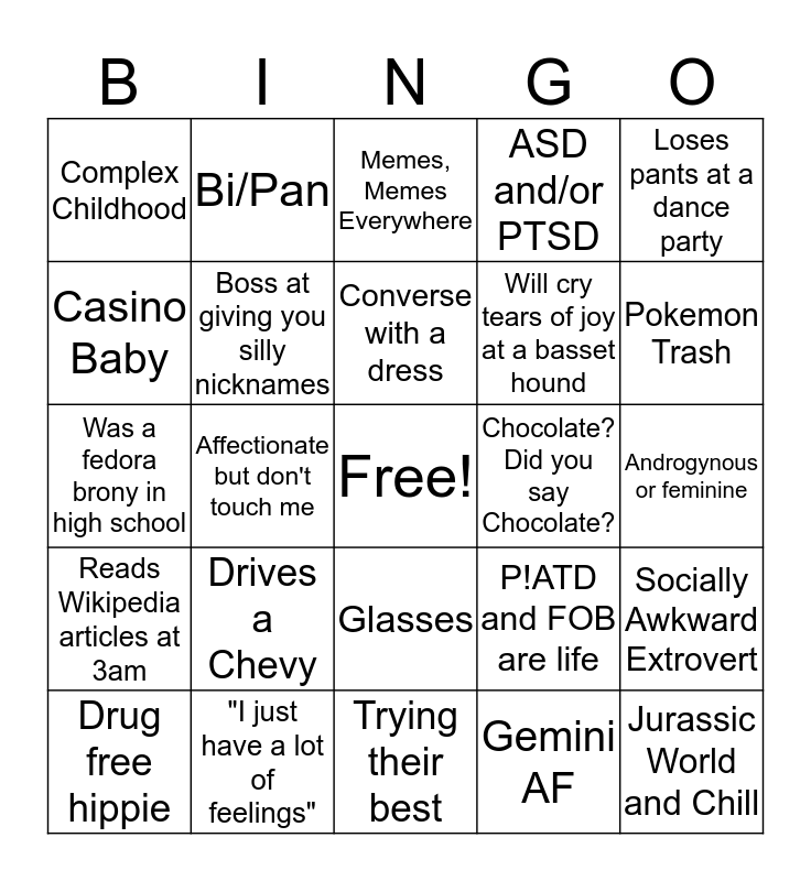This bingo card has a free space and 24 words: Drives a Chevy, "I just have a lot of feelings", Converse with a dress, Drug free hippie, Loses pants at a dance party, Complex Childhood, Casino Baby, Bi/Pan, Chocolate? Did you say Chocolate?, Glasses, Will cry tears of joy at a basset hound, Was a fedora brony in high school, P!ATD and FOB are life, Socially Awkward Extrovert, Boss at giving you silly nicknames, Gemini AF, Androgynous or feminine, Memes, Memes Everywhere, Pokemon Trash, Affectionate but don't touch me, Jurassic World and Chill, Reads Wikipedia articles at 3am, ASD and/or PTSD and Trying their best.