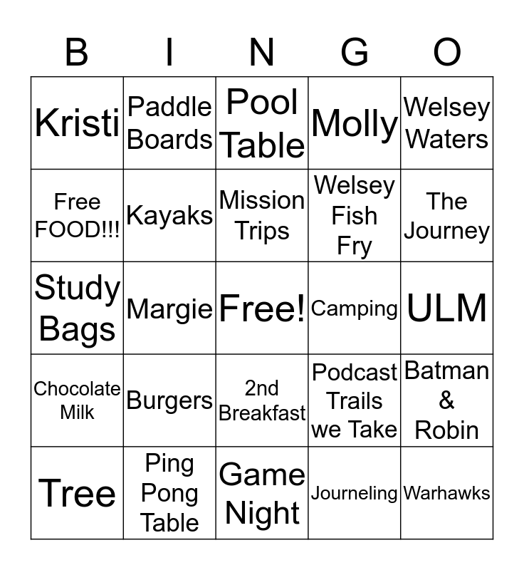 This bingo card has a free space and 29 words: Tree, Bear, Margie, Alan, Kristi, Pool Table, Kayaks, Burgers, Camping, Ping Pong Table, ULM, Warhawks, Game Night, Journeling, The Journey, Welsey, 2nd Breakfast, Chocolate Milk, Welsey Waters, Study Bags, Podcast Trails we Take, Wesley Warriors Intramural, Welsey Fish Fry, Free FOOD!!!, Molly, Paddle Boards, Batman & Robin, Mission Trips and Capture the Flag.