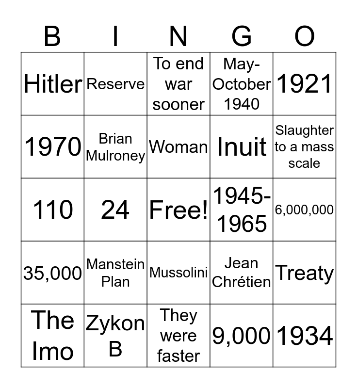 This bingo card has a free space and 50 words: 11,000, Zykon B, 8,000, 9,000, Treaty, Crown, Reserve, Metis, Inuit, 2003, 1970, Brian Mulroney, Jean Chrétien, 1934, Born after WWII, 1945, To end war sooner, 1945-1965, Lester B. Pearson, Hitler, Manstein Plan, They were faster, May-October 1940, Slaughter to a mass scale, Hockey, Strange Fugitive, Woman, Jazz, 1921, 35,000, June 28,1914, 1906, Propoganda, ID Disks, Eva Braun, April 30, 1945, 18,000, 1,074, 359, 110, 14,000, 150,000, June 6, 1944, 14,000, The Imo, 24, Mussolini, 2,000, 6,000,000 and 1917.