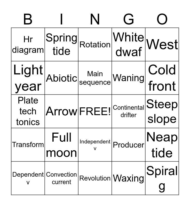 This bingo card has a free space and 24 words: Full moon, Convection current, Main sequence, Dependent v, West, Hr diagram, Light year, Spring tide, Continental drifter, Independent v, Waning, Plate tech tonics, Producer, Neap tide, Abiotic, Waxing, Steep slope, Rotation, Cold front, Arrow, Spiral g, Transform, White dwaf and Revolution.