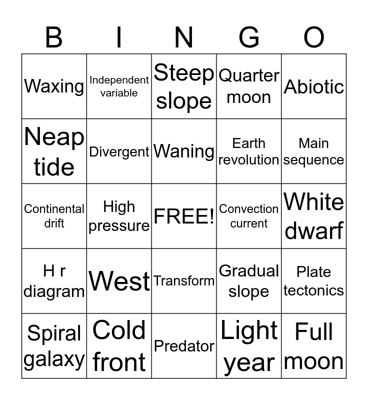 This bingo card has a free space and 24 words: West, Cold front, Waning, Spiral galaxy, Abiotic, Waxing, Neap tide, Independent variable, Convection current, Transform, Earth revolution, Continental drift, Gradual slope, Plate tectonics, Divergent, Light year, White dwarf, Steep slope, Main sequence, High pressure, Full moon, H r diagram, Quarter moon and Predator.