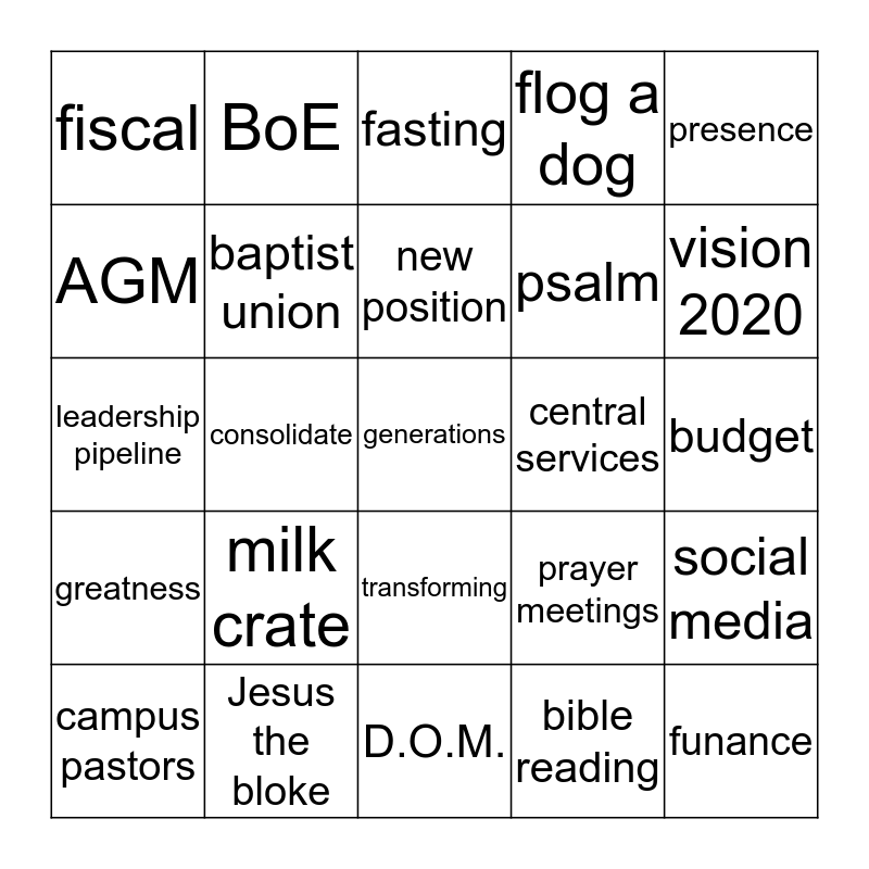 This bingo card has 42 words: staff movements, new position, renovation, milk crate, bible reading, social media, generations, prayer, fasting, transforming, budget, vision 2020, consolidate, presence, podcast, prayer meetings, transformation, leadership pipeline, beyond vision 2020, BoE, AGM, alpha, funance, fiscal, new campus, worship, psalm, fundamental, training, GMS, devotional, greatness, baptist union, D.O.M., process, campus pastors, Jesus the bloke, central services, series, rest, flog a dog and Aurelia.