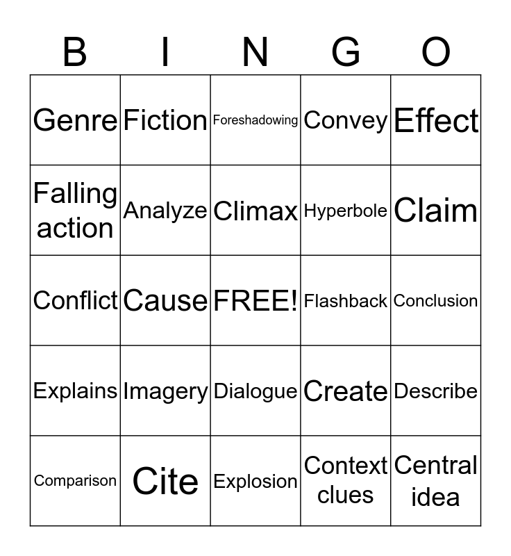 This bingo card has a free space and 24 words: Imagery, Cite, Climax, Comparison, Effect, Genre, Falling action, Fiction, Flashback, Dialogue, Hyperbole, Conflict, Create, Describe, Analyze, Context clues, Conclusion, Foreshadowing, Claim, Cause, Central idea, Explains, Convey and Explosion.