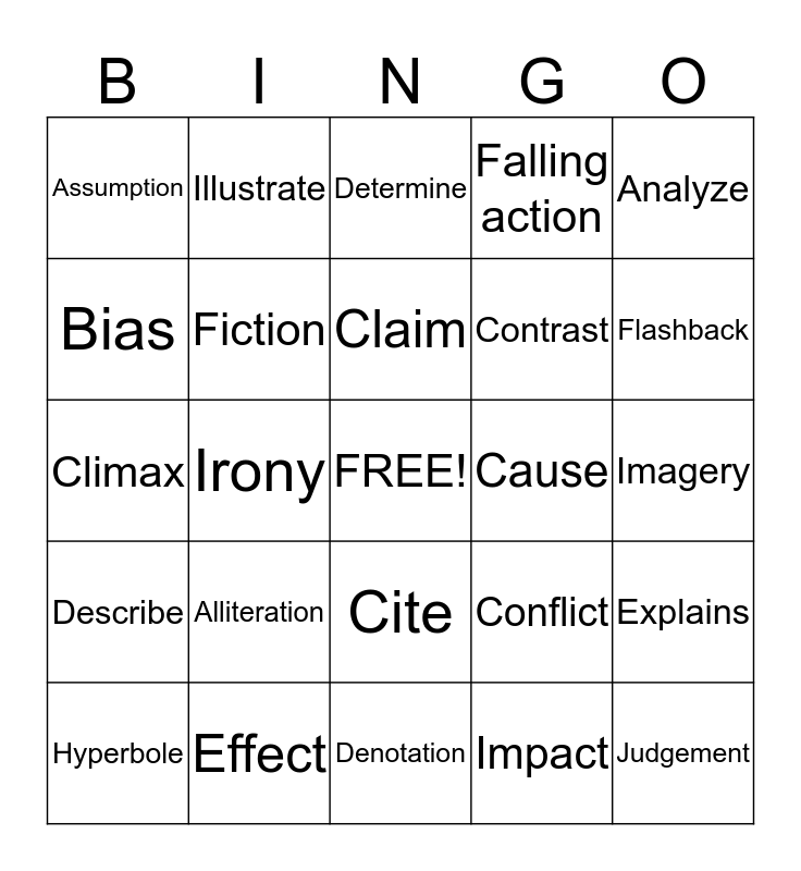 This bingo card has a free space and 24 words: Alliteration, Effect, Claim, Hyperbole, Analyze, Assumption, Bias, Illustrate, Cause, Cite, Contrast, Climax, Conflict, Explains, Fiction, Impact, Imagery, Determine, Flashback, Irony, Judgement, Describe, Falling action and Denotation.