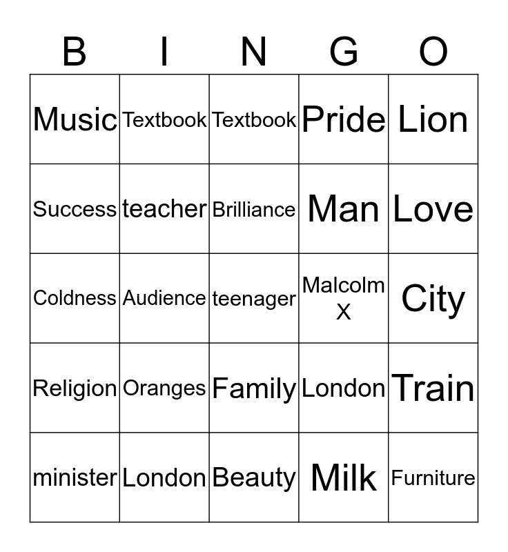 This bingo card has 70 words: Man, City, Religion, Malcolm X, London, Love, Pride, Apple, Lion, Pencil, Train, Milk, Music, Textbook, Snowball, Audience, Family, Man, City, Religion, Malcolm X, London, Love, Pride, Apple, Lion, Pencil, Train, Milk, Music, Textbook, Snowball, Audience, Family, Memphis, Clothes, Animal, Gaggle, Car, Success, Furniture, Oranges, teenager, grandmother, student, teacher, minister, businessperson, salesclerk, country, continent, coffee shop, restaurant, zoo, Beauty, Bravery, Brilliance, Brutality, Calmness, Charity, Coldness, Compassion, Logic, Management, Literature, Oil, Paper, Power, Poverty and Violence.