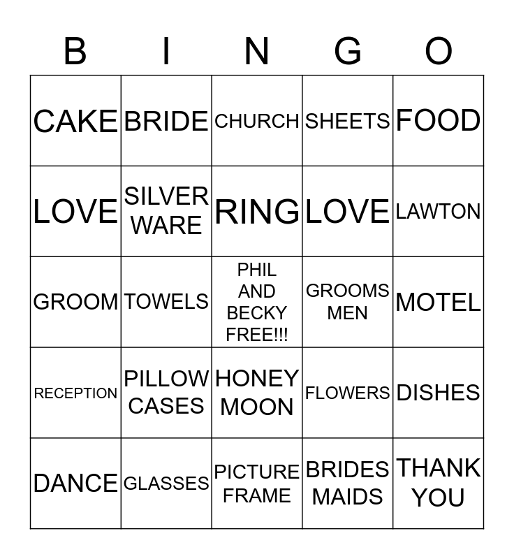 This bingo card has a free space and 24 words: PILLOW CASES, GLASSES, RING, DANCE, FOOD, CAKE, LOVE, BRIDE, GROOMS MEN, HONEY MOON, LOVE, GROOM, FLOWERS, DISHES, SILVER WARE, BRIDES MAIDS, MOTEL, CHURCH, LAWTON, TOWELS, THANK YOU, RECEPTION, SHEETS and PICTURE FRAME.
