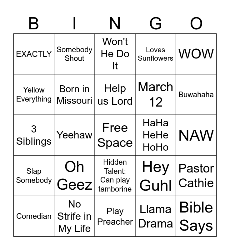 This bingo card has a free space and 28 words: Pastor Cathie, 51 years old, March 12, Llama Drama, Yellow Everything, Won't He Do It, Somebody Shout, Slap Somebody, HaHa HeHe HoHo, Comedian, 3 Siblings, Loves Sunflowers, No Strife in My Life, Play Preacher, Buwahaha, Bless Her Heart, Oh Geez, Born in Missouri, Help us Lord, Hidden Talent: Can play tamborine, EXACTLY, Coffee with Cathie, Bible Says, Yeehaw, NAW, Hey Guhl, WOW and I Got You.