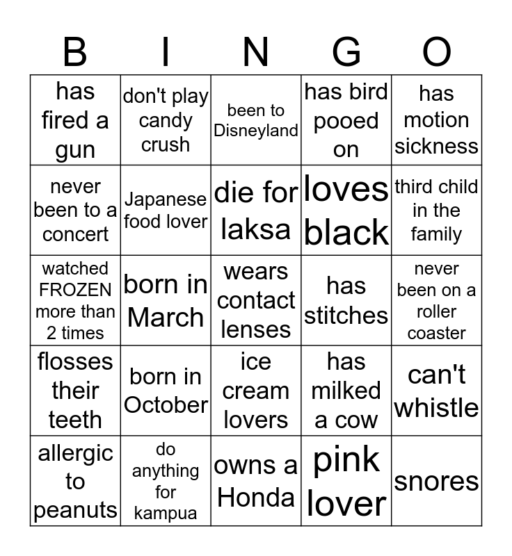 This bingo card has 25 words: born in October, owns a Honda, die for laksa, allergic to peanuts, has motion sickness, has fired a gun, never been to a concert, don't play candy crush, has stitches, ice cream lovers, loves black, watched FROZEN more than 2 times, has milked a cow, can't whistle, Japanese food lover, snores, never been on a roller coaster, been to Disneyland, third child in the family, born in March, wears contact lenses, do anything for kampua, flosses their teeth, has bird pooed on and pink lover.