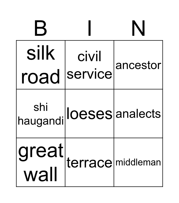 This bingo card has a free space and 8 words: analects, ancestor, civil service, great wall, silk road, middleman, shi haugandi and terrace.