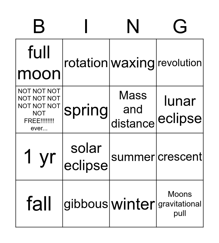 This bingo card has 16 words: gibbous, crescent, waxing, full moon, 1 yr, rotation, summer, winter, NOT NOT NOT NOT NOT NOT NOT NOT NOT NOT FREE!!!!!!!! ever..., spring, fall, revolution, solar eclipse, lunar eclipse, Mass and distance and Moons gravitational pull.