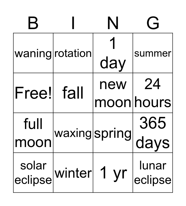 This bingo card has 16 words: winter, 365 days, 1 day, waning, full moon, rotation, spring, 1 yr, Free!, fall, solar eclipse, summer, waxing, 24 hours, new moon and lunar eclipse.
