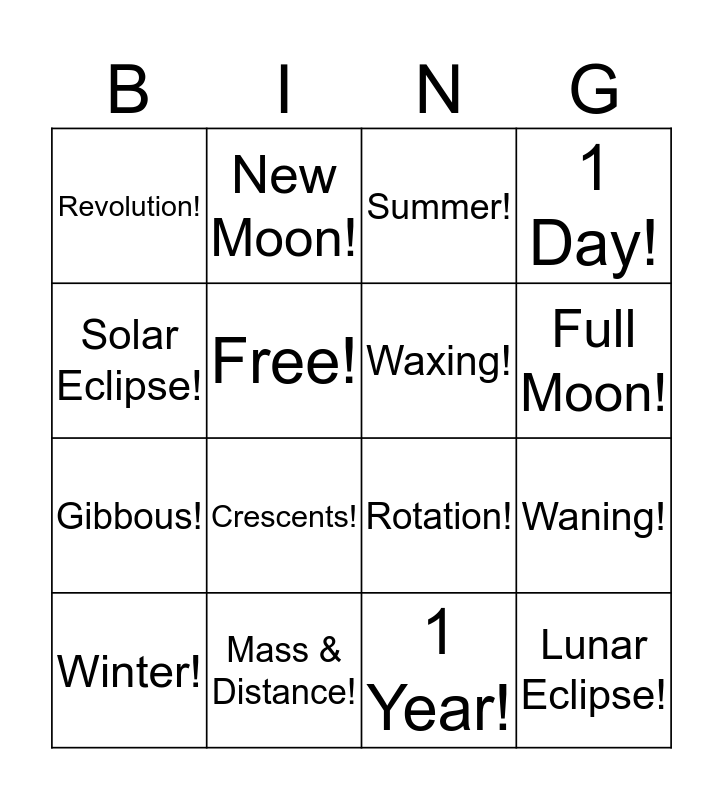 This bingo card has 16 words: Mass & Distance!, Waning!, Summer!, Revolution!, Gibbous!, New Moon!, Rotation!, 1 Year!, Solar Eclipse!, Free!, Winter!, 1 Day!, Crescents!, Full Moon!, Waxing! and Lunar Eclipse!.