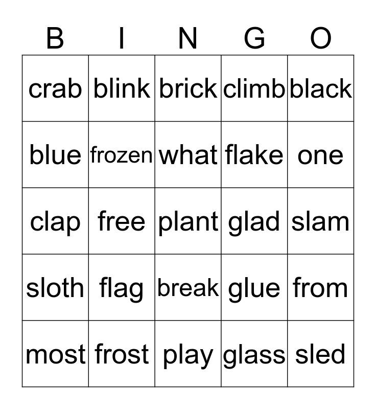 This bingo card has 30 words: frost, brown, free, crib, crab, brick, frozen, break, glad, play, slam, plant, glass, sled, one, said, glue, sloth, flag, black, clap, cliff, blink, flake, blue, climb, from, most, what and come.