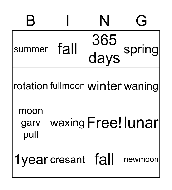 This bingo card has 16 words: cresant, lunar, 365 days, summer, moon garv pull, fall, Free!, fall, rotation, fullmoon, 1year, spring, waxing, waning, winter and newmoon.