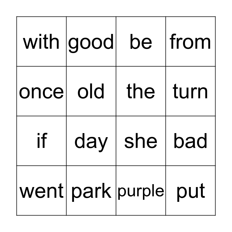 This bingo card has 57 words: not, a, for, with, that, it, the, we, if, at, from, no, of, one, they, said, once, bad, got, went, park, like, can, be, are, turn, poor, need, day, white, red, orange, yellow, blue, purple, old, new, she, he, put, good, why, what, were, some, more, people, water, who, how, made, come, each, an, so, look and first.