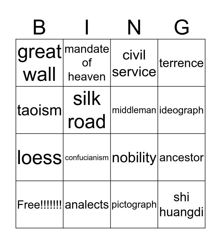 This bingo card has 16 words: analects, ancestor, civil service, great wall, loess, mandate of heaven, nobility, pictograph, taoism, silk road, Free!!!!!!!, terrence, confucianism, ideograph, middleman and shi huangdi.