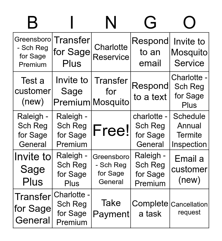 This bingo card has a free space and 33 words: Invite to Sage General, Transfer for Mosquito, Raleigh - Sch Reg for Sage Premium, Invite to Sage General, Invite to Sage Plus, Invite to Sage Premium, Invite to Mosquito Service, Transfer for Sage General, Transfer for Sage Plus, Transfer for Sage Premium, Transfer for Mosquito, Charlotte Reservice, Greensboro Reservice, Raleign Reservice, charlotte - Sch Reg for Sage General, Charlotte - Sch Reg for Sage Plus, Charlotte - Sch Reg for Sage Premium, Raleigh - Sch Reg for Sage General, Raleigh - Sch Reg for Sage Plus, Raleigh - Sch Reg for Sage Premium, Greensboro - Sch Reg for Sage General, Greensboro - Sch Reg for Sage Plus, Greensboro - Sch Reg for Sage Premium, Schedule Annual Termite Inspection, Take Payment, Cancellation request, Respond to an email, Respond to a text, Test a customer (new), Email a customer (new), Call customer from DP, Complete a task and Respond to a Voicemail.