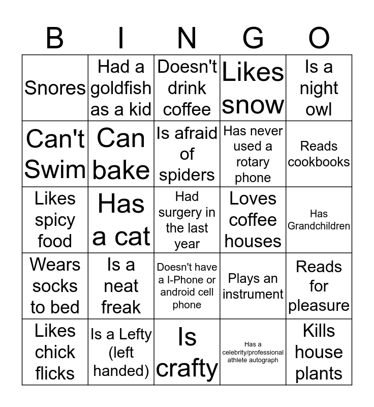 This bingo card has a free space and 24 words: Is a neat freak, Is a Lefty (left handed), Is afraid of spiders, Likes chick flicks, Is a night owl, Snores, Can't Swim, Had a goldfish as a kid, Loves coffee houses, Doesn't have a I-Phone or android cell phone, Has never used a rotary phone, Likes spicy food, Plays an instrument, Reads for pleasure, Can bake, Has a celebrity/professional athlete autograph, Has Grandchildren, Doesn't drink coffee, Reads cookbooks, Has a cat, Kills house plants, Wears socks to bed, Likes snow and Is crafty.