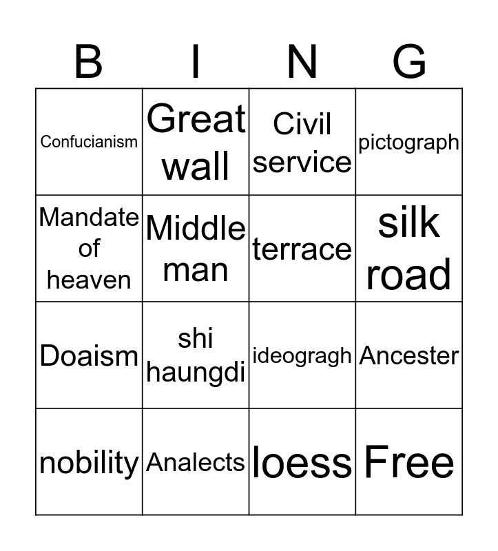 This bingo card has 16 words: Analects, Ancester, Civil service, Confucianism, Doaism, Great wall, ideogragh, loess, Mandate of heaven, Middle man, nobility, pictograph, shi haungdi, silk road, terrace and Free.