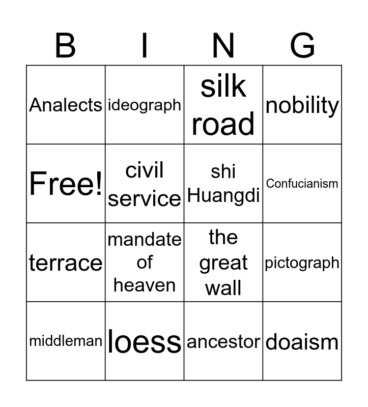 This bingo card has 16 words: loess, pictograph, silk road, Analects, terrace, ideograph, the great wall, ancestor, Free!, civil service, middleman, nobility, mandate of heaven, Confucianism, shi Huangdi and doaism.