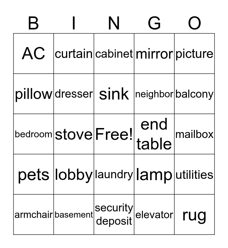 This bingo card has a free space and 24 words: lobby, basement, sink, armchair, picture, AC, pillow, curtain, end table, laundry, neighbor, bedroom, lamp, utilities, dresser, elevator, mailbox, cabinet, balcony, stove, rug, pets, mirror and security deposit.