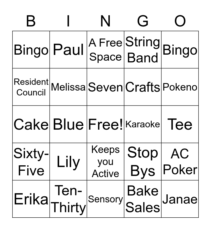 This bingo card has a free space and 24 words: Lily, Ten- Thirty, Seven, Erika, Bingo, Bingo, Resident Council, Paul, Karaoke, Keeps you Active, Crafts, Cake, Stop Bys, AC Poker, Melissa, Bake Sales, Tee, A Free Space, Pokeno, Blue, Janae, Sixty- Five, String Band and Sensory.