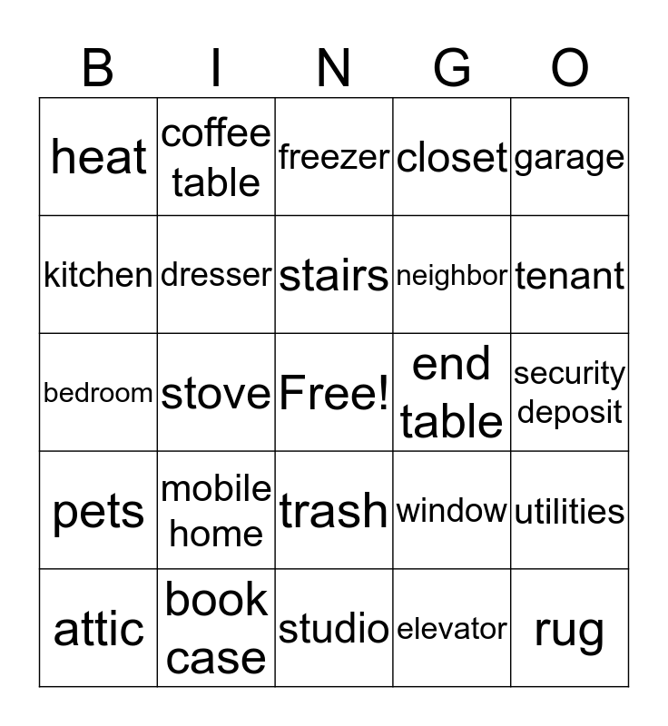 This bingo card has a free space and 24 words: mobile home, book case, stairs, attic, garage, heat, kitchen, coffee table, end table, trash, neighbor, bedroom, window, utilities, dresser, elevator, security deposit, freezer, tenant, stove, rug, pets, closet and studio.