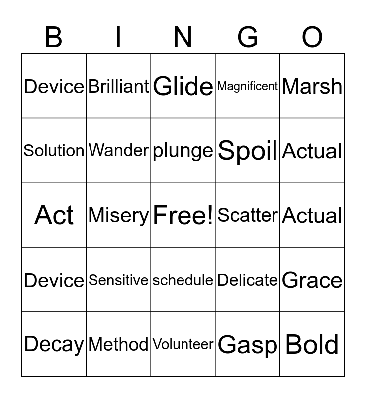 This bingo card has a free space and 44 words: Border, Bold, Brief, Decay, Deed, Gasp, Glide, Globe, Marsh, Method, Magnificent, Scatter, schedule, Sensitive, Value, Volunteer, Vision, Act, Active, Actual, Brilliant, cable, Delicate, Device, Active, Actual, Brilliant, Cable, Delicate, Device, Diagram, Grace, Gradual, Grasp, Misery, Moisture, Mural, Perform, plunge, Solution, Spoil, Signal, Wander and Wisdom.