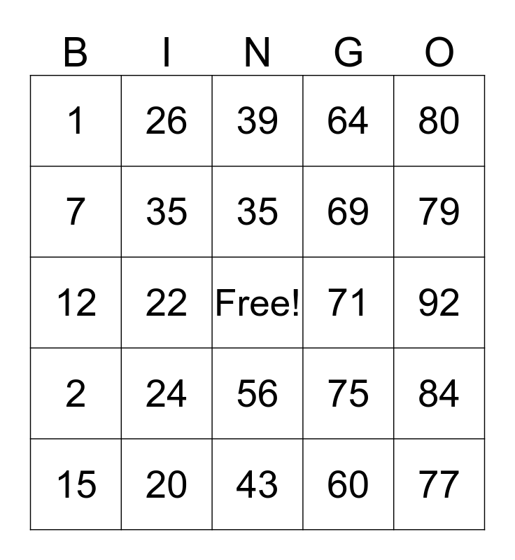 This bingo card has a free space and 24 words: 15, 24, 35, 60, 80, 1, 26, 39, 71, 92, 12, 35, 75, 84, 7, 20, 43, 64, 79, 2, 22, 56, 69 and 77.