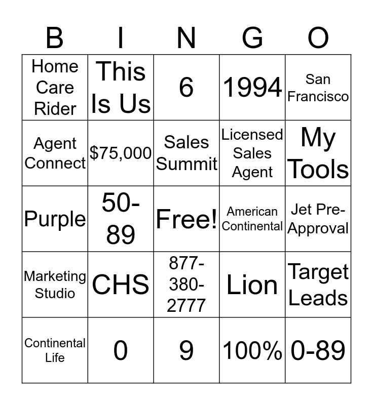 This bingo card has 1 images, a free space and 28 words: Continental Life, $300, 50-89, Home Care Rider, 6, $75,000, CHS, American Continental, 0, Jet Pre-Approval, 0-89, 9, 100%, My Tools, True, 877-380-2777, Marketing Studio, San Francisco, Purple, Lion, Cooking, Licensed Sales Agent, Agent Connect, 1994, This Is Us, Target Leads, Sales Summit and Better Leads Bootcamp.
