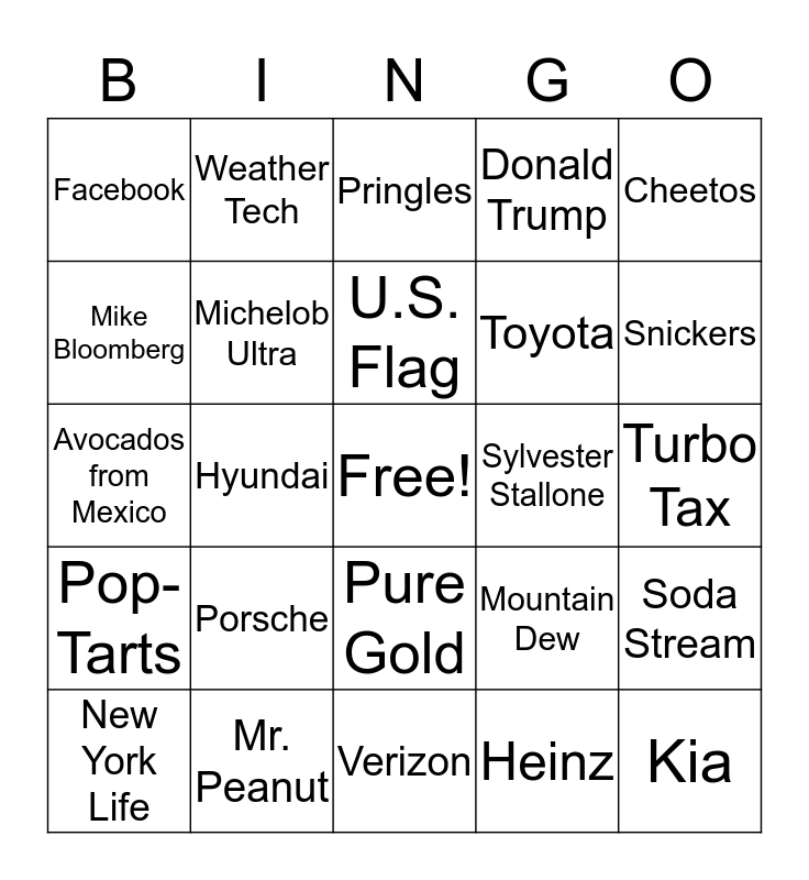 This bingo card has a free space and 35 words: Budweiser, Bud Light, Bud Light Seltzer, Michelob Ultra, Pure Gold, Donald Trump, Mike Bloomberg, Olay, U.S. Flag, Audi, Avocados from Mexico, Cheetos, Coca-Cola, Doritos, Facebook, Sylvester Stallone, Heinz, Hyundai, Pop-Tarts, Kia, Mountain Dew, New York Life, Soda Stream, Mr. Peanut, Pringles, Snickers, Sabra, Square space, Toyota, Turbo Tax, Turkish Airlines, Verizon, Porsche, Weather Tech and Mahomes.