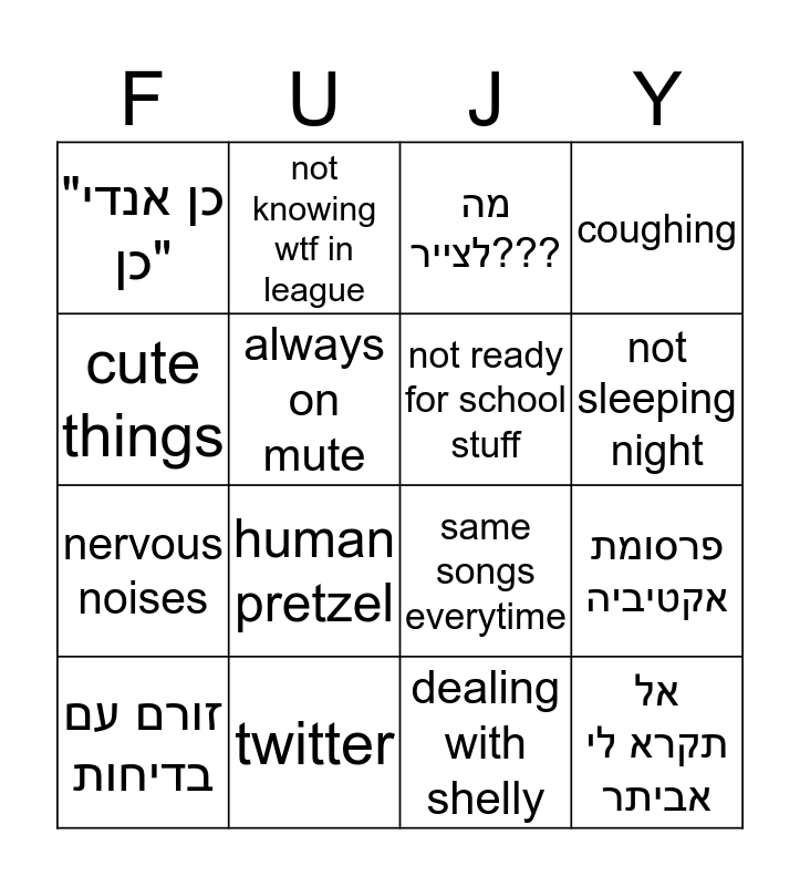 This bingo card has 16 words: twitter, פרסומת אקטיביה, מה לצייר???, "כן אנדי כן", nervous noises, not knowing wtf in league, same songs everytime, dealing with shelly, cute things, always on mute, זורם עם בדיחות, coughing, human pretzel, not sleeping night, not ready for school stuff and אל תקרא לי אביתר.