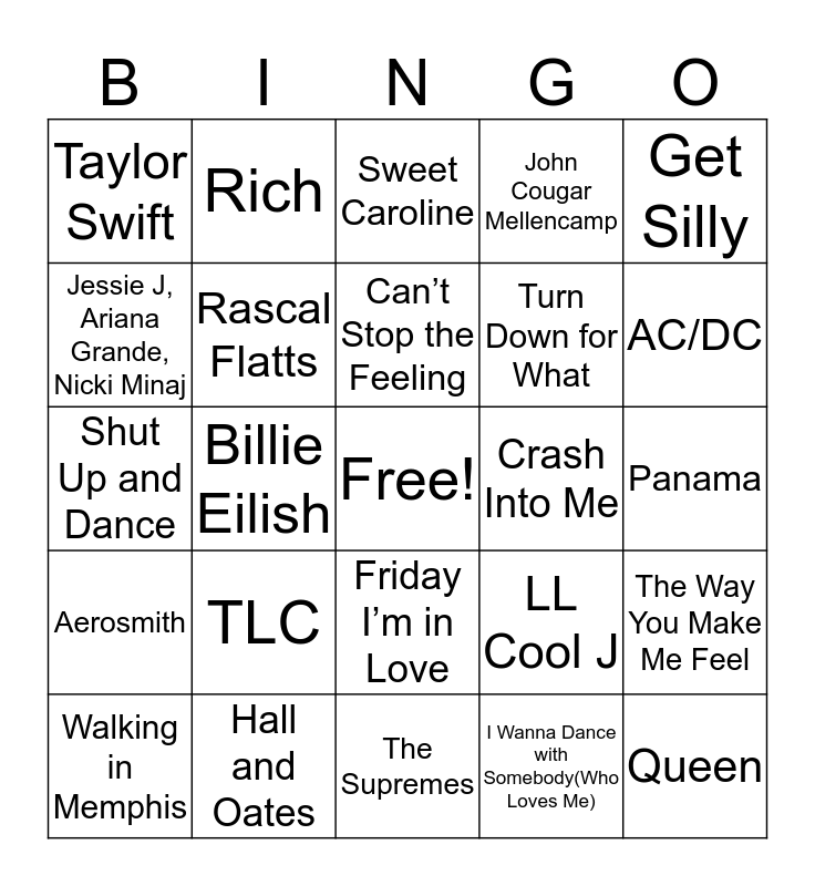 This bingo card has a free space and 44 words: Respect, Queen, Don’t stop Believin’, Walking in Memphis, The Sugarhill Gang, I Wanna Dance with Somebody(Who Loves Me), Sweet Caroline, Cupid Shuffle, Get Silly, Hall and Oates, John Cougar Mellencamp, Crash Into Me, Friday I’m in Love, TLC, Groove is in the Heart, The Supremes, Sister Hazel, Shut Up and Dance, Centerfold, AC/DC, Rich, Heads Carolina, Tails California, Marshmello, Kane Brown, Taylor Swift, Yakety Yak, Panama, Duran Duran, Kids in America, LL Cool J, Aerosmith, Cruel Summer, The Way You Make Me Feel, Sussudio, Panic! At the Disco, Billie Eilish, Flo Rida, We R Who We R, Domino – Jessie J, Can’t Stop the Feeling, Jessie J, Ariana Grande, Nicki Minaj, Turn Down for What, T-Pain, Rascal Flatts and Everyday is a Winding Road.