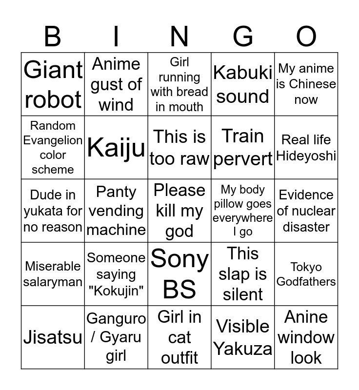 This bingo card has 25 words: Someone saying "Kokujin", Girl in cat outfit, This is too raw, Jisatsu, My anime is Chinese now, Giant robot, Random Evangelion color scheme, Anime gust of wind, My body pillow goes everywhere I go, Sony BS, Train pervert, Dude in yukata for no reason, This slap is silent, Tokyo Godfathers, Kaiju, Anine window look, Evidence of nuclear disaster, Girl running with bread in mouth, Real life Hideyoshi, Panty vending machine, Please kill my god, Ganguro / Gyaru girl, Miserable salaryman, Kabuki sound and Visible Yakuza.