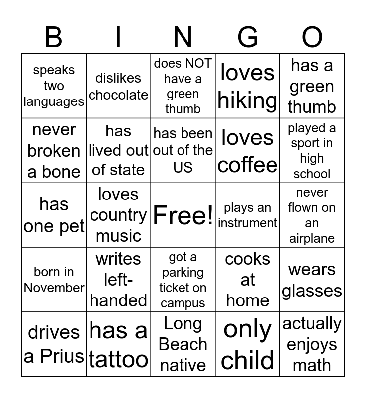 This bingo card has a free space and 24 words: writes left-handed, has a tattoo, has been out of the US, drives a Prius, has a green thumb, speaks two languages, never broken a bone, dislikes chocolate, plays an instrument, got a parking ticket on campus, loves coffee, has one pet, cooks at home, wears glasses, has lived out of state, only child, never flown on an airplane, does NOT have a green thumb, played a sport in high school, loves country music, actually enjoys math, born in November, loves hiking and Long Beach native.