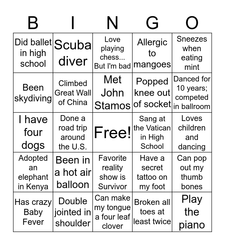 This bingo card has a free space and 24 words: Been in a hot air balloon, Double jointed in shoulder, Met John Stamos, Has crazy Baby Fever, Sneezes when eating mint, Did ballet in high school, Been skydiving, Scuba diver, Sang at the Vatican in High School, Favorite reality show is Survivor, Popped knee out of socket, I have four dogs, Have a secret tattoo on my foot, Can pop out my thumb bones, Climbed Great Wall of China, Broken all toes at least twice, Loves children and dancing, Love playing chess... But I'm bad, Danced for 10 years; competed in ballroom, Done a road trip around the U.S., Play the piano, Adopted an elephant in Kenya, Allergic to mangoes and Can make my tongue a four leaf clover.
