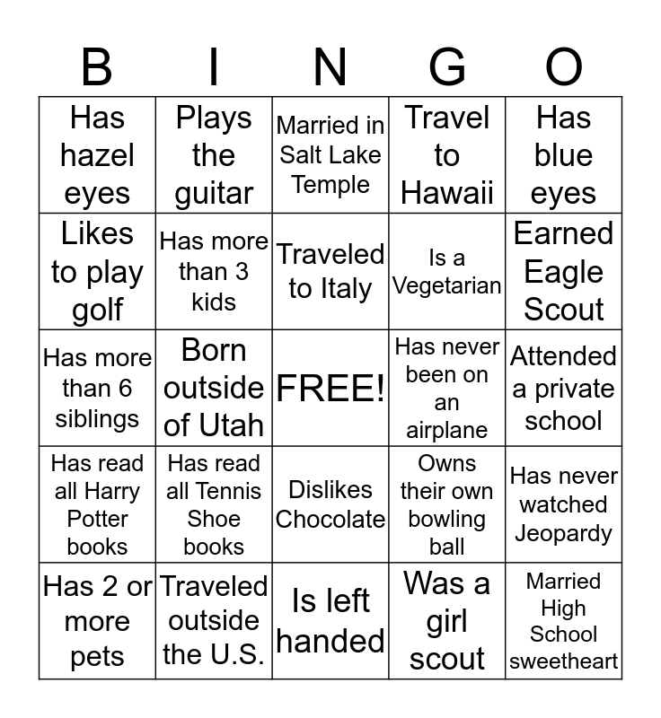 This bingo card has a free space and 24 words: Has read all Tennis Shoe books, Traveled outside the U.S., Traveled to Italy, Has 2 or more pets, Has blue eyes, Has hazel eyes, Likes to play golf, Plays the guitar, Has never been on an airplane, Dislikes Chocolate, Is a Vegetarian, Has more than 6 siblings, Owns their own bowling ball, Has never watched Jeopardy, Has more than 3 kids, Was a girl scout, Attended a private school, Married in Salt Lake Temple, Earned Eagle Scout, Born outside of Utah, Married High School sweetheart, Has read all Harry Potter books, Travel to Hawaii and Is left handed.