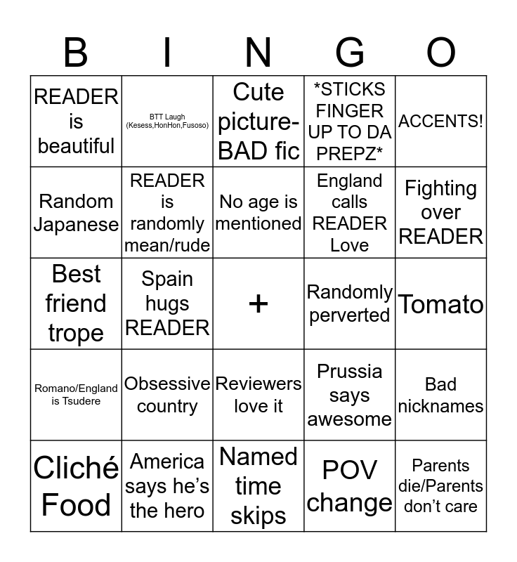 This bingo card has a free space and 24 words: Obsessive country, America says he’s the hero, No age is mentioned, Cliché Food, ACCENTS!, READER is beautiful, Random Japanese, BTT Laugh (Kesess,HonHon,Fusoso), Randomly perverted, Reviewers love it, England calls READER Love, Best friend trope, Prussia says awesome, Bad nicknames, READER is randomly mean/rude, POV change, Tomato, Cute picture-BAD fic, Fighting over READER, Spain hugs READER, Parents die/Parents don’t care, Romano/England is Tsudere, *STICKS FINGER UP TO DA PREPZ* and Named time skips.