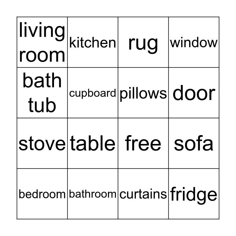 This bingo card has 20 words: sofa, chair, rug, bed, bedroom, bath tub, bathroom, living room, stove, kitchen, table, free, cupboard, fridge, pillows, dresser, door, window, curtains and blanket.